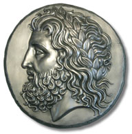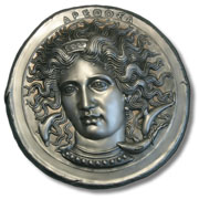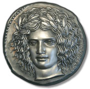 by the artist Herakleidas on a silver tetradrachm of the Sicilian city of Katane, circa 413-404 B.C.